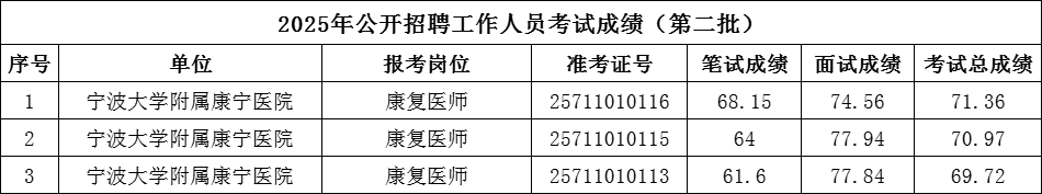 根据《2025年宁波市卫生健康委员会直属事业单位公开招聘工作人员公告(第二批)》规定的程序、要求及招聘岗位计划数,经笔试、面试,现将成绩公布如下(详见附件)。